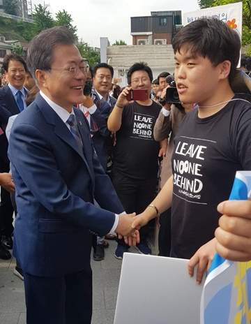 2018년 6월 8일 지방선거 사전투표 날, 발달장애인 당사자인 한국피플퍼스트 김대범 활동가는 서울 종로구 삼청동 주민센터에서 문재인 대통령을 만나 발달장애인이 알기 쉬운 선거공보물과 그림투표용지를 만들어달라고 전했다.ⓒ에이블뉴스DB 에이블포토로 보기▲ 2018년 6월 8일 지방선거 사전투표 날, 발달장애인 당사자인 한국피플퍼스트 김대범 활동가는 서울 종로구 삼청동 주민센터에서 문재인 대통령을 만나 발달장애인이 알기 쉬운 선거공보물과 그림투표용지를 만들어달라고 전했다.ⓒ에이블뉴스DB
