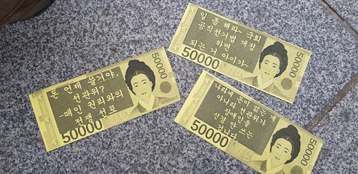 신사임당이 그려진 가짜 5만원권 지폐. 장애인 참정권 보장 메시지가 담겨있다.ⓒ에이블뉴스 에이블포토로 보기▲ 신사임당이 그려진 가짜 5만원권 지폐. 장애인 참정권 보장 메시지가 담겨있다.ⓒ에이블뉴스
