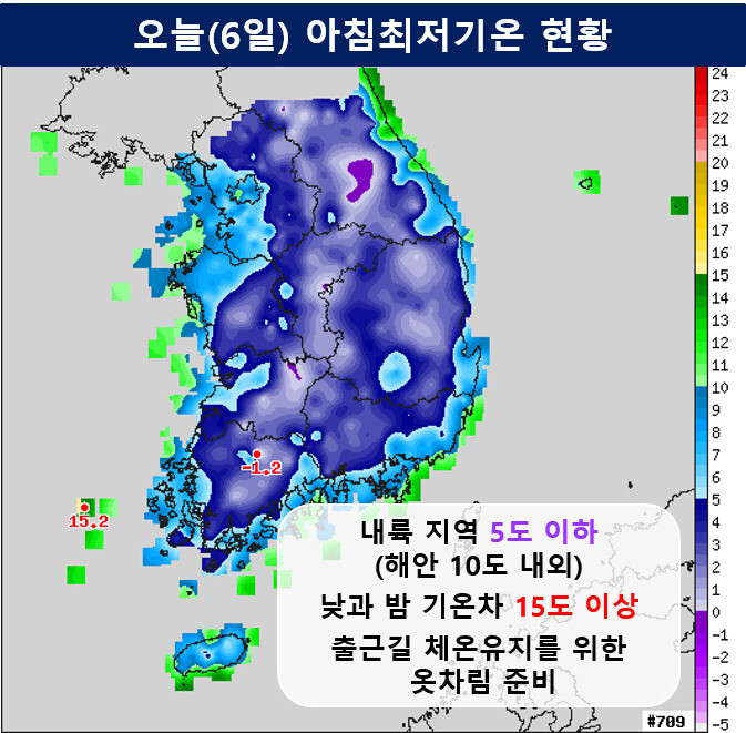 6일 아침에는 밤 사이 맑은 날씨에 기온이 큰 폭으로 떨어져 추풍령과 함양에서는 역대 5월 최저기온 가운데 가장 낮은 기온이 기록되고, 강원 내륙지역은 아침기온이 영하로 내려갔다. 추풍령에서는 아침 최저기온이 1.7도가 관측돼 1935년 기상 관측 시작 이래 2014년 5월7일과 마찬가지로 가장 낮은 기온이 기록됐다. 함양은 1.3도, 강원 횡성(안흥)은 영하 0.5도, 철원(김화) 영하 0.4도, 홍천(내면) 영하 0.3도, 화천(상서) 영하 0.2도 등이 관측됐다.