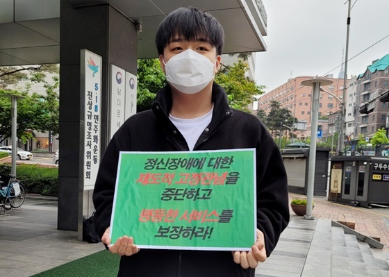 ‘정신장애에 대한 제도적 고정관념을 중단하고 평등한 서비스를 보장하라!’ 피켓을 들고 있는 활동가. ⓒ에이블뉴스 에이블포토로 보기▲ ‘정신장애에 대한 제도적 고정관념을 중단하고 평등한 서비스를 보장하라!’ 피켓을 들고 있는 활동가. ⓒ에이블뉴스