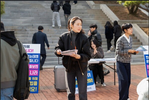 현실을 반영하지 못한 법을 바꾸기 위해 1형 당뇨인의 차별현실을 알리는 캠페인을 김미라를 비롯한 환우회 소속 구성원들이 하는 모습. ©스튜디오타깃