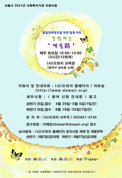 사단법인 도와지가 2021년 사회복지기금 지원사업 발달장애청년을 위한 힐링아트-경험하는 ‘예술路’ 프로그램에 참여할 발달장애청년(20세~35세)을 모집한다.