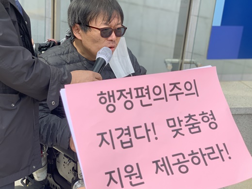 ‘행정편의주의 지겹다! 맞춤형 지원 제공하라!’ 피켓을 든 중증장애인.ⓒ전국장애인차별철폐연대 에이블포토로 보기▲ ‘행정편의주의 지겹다! 맞춤형 지원 제공하라!’ 피켓을 든 중증장애인.ⓒ전국장애인차별철폐연대
