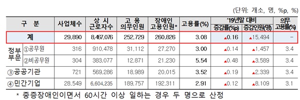 장애인 의무고용 사업체의 장애인고용률은 3.08%로 전년 대비 0.16%p 증가했으며, 4개 부문 세부통계 모두(▲국가·지자체 공무원 ▲국가·지자체 근로자 ▲공공기관 ▲민간기업) 고용률이 상승했다.