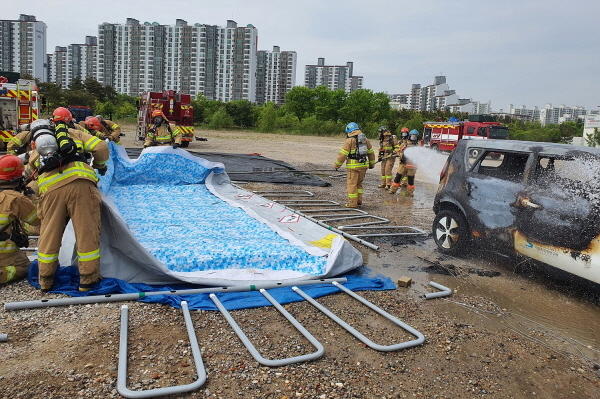 소방서는 이러한 전기자동차의 특성에 맞춘 화재진압 대책 마련을 위해 ‘조립식 수조’를 활용하여 화재를 진압하는 방법을 모색하였고, 화재 발생 시 초기 화재를 진압한 뒤 화세가 안정되었을 때 소방차 크레인이나 지게차를 사용하여 차량을 수조에 침수시켜 화재를 완전히 진압하는 실험을 진행하였다.