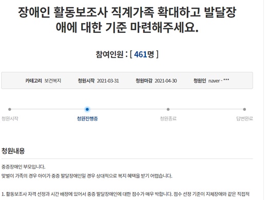 '장애인 활동보조사 직계가족 확대하고 발달장애에 대한 기준 마련해주세요. '국민청원.ⓒ청와대 홈페이지 에이블포토로 보기▲ '장애인 활동보조사 직계가족 확대하고 발달장애에 대한 기준 마련해주세요. '국민청원.ⓒ청와대 홈페이지