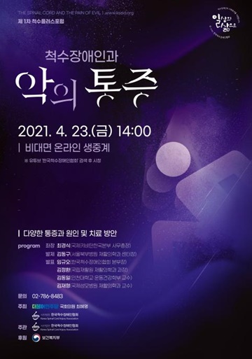 한국척수장애인협회가 오는 23일 오후2시 서울 여의도 이룸센터에서 “척수장애인과 악의 통증”이라는 주제로 2021년도 제1차 척수플러스 포럼을 개최한다.