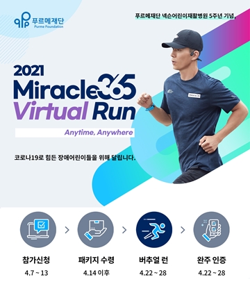 푸르메재단(이사장 강지원)이 오는 13일까지 푸르메재단 넥슨어린이재활병원 개원 5주년을 기념해 개최하는 ‘2021 미라클365 버추얼런(이하 미라클365런)’ 참가자를 모집한다.