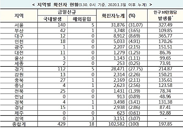 한편, 질병관리청 중앙방역대책본부는 30일 0시 기준으로 국내 발생 신규 확진자는 429명, 해외유입 사례는 18명이 확인되어 총 누적 확진자 수는 102,582명(해외유입 7,576명)이라고 밝혔다.