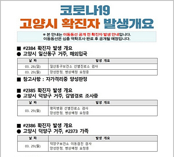 고양시, 확진자 8명(2384~2391번) 발생 '3명은 감염경로 조사중'