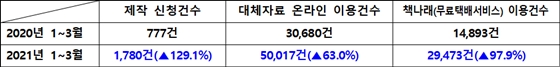 대체자료 온라인 이용 건수는 30,680건에서 50,017건으로 63.0%, 책나래(무료택배서비스) 이용 건수는 14,893건에서 29,473건으로 97.9% 향상했다.