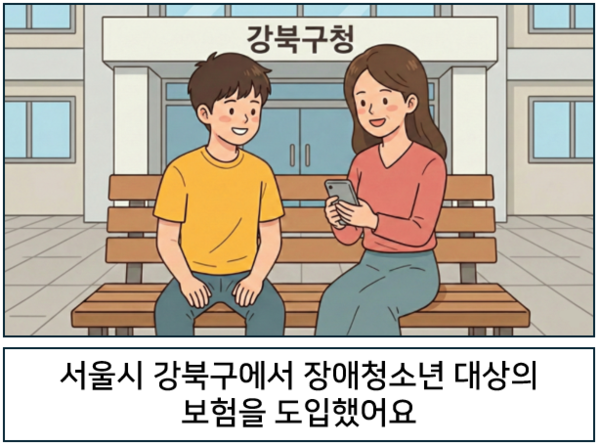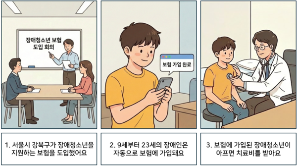 1 서울시 강북구가 장애청소년을 지원하는 보험을 도입했어요. 2 9세부터 23세의 장애인은 자동으로 보험에 가입돼요. 3 보험에 가입된 장애청소년이 아프면 치료비를 받아요. ©AI 편집실