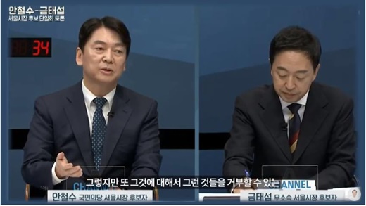 서울시장 후보 단일화 토론회 때 퀴어차별 발언을 한 안철수 후보와 이에 대해 반박하는 금태섭 후보의 모습. ⓒ금태섭 TV영상캡처 에이블포토로 보기▲ 서울시장 후보 단일화 토론회 때 퀴어차별 발언을 한 안철수 후보와 이에 대해 반박하는 금태섭 후보의 모습. ⓒ금태섭 TV영상캡처