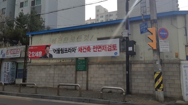 오 후보 측은 보궐선거 공식선거운동 시작일인 지난 25일 서울 강서구 지역에 ‘기호 2번 국민의 힘 오세훈 어울림프라자 재건축 전면 재검토’ 라는 공약 현수막을 내걸었다.