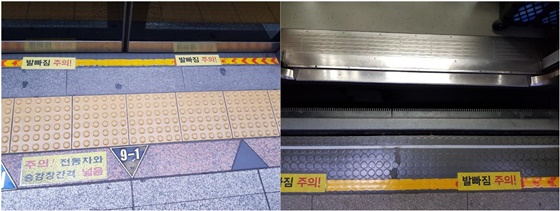 발빠짐 주의 표시와 방송만 있어 장애인 등에게 위험성이 존재하는 지하철 3호선 충무로역 승강장 연단(좌측), 전동차가 도착하자 스크린 도어 열리고 전동차 문 열린 후 전동차와 승강장 연단 사이의 간격(우측) ⓒ이원무 에이블포토로 보기▲ 발빠짐 주의 표시와 방송만 있어 장애인 등에게 위험성이 존재하는 지하철 3호선 충무로역 승강장 연단(좌측), 전동차가 도착하자 스크린 도어 열리고 전동차 문 열린 후 전동차와 승강장 연단 사이의 간격(우측) ⓒ이원무이 두 장애인은 승강장과 차량 사이의 높은 단차와 넓은 간격 방치를 시정할 것을 서울교통공사에 요구하는 지하철 단차 소송을 공익인권법재단 공감의 지원으로 하게 됐다.