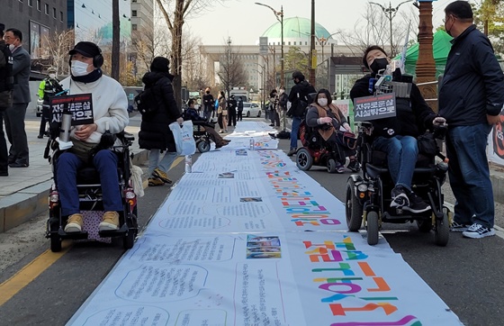 19일 서울 여의도 이룸센터 앞에 전국장애인차별철폐연대 등 장애인 단체는 장애인탈시설지원법 제정을 촉구하며 탈시설 로드를 깔았다. ⓒ에이블뉴스 에이블포토로 보기▲ 19일 서울 여의도 이룸센터 앞에 전국장애인차별철폐연대 등 장애인 단체는 장애인탈시설지원법 제정을 촉구하며 탈시설 로드를 깔았다. ⓒ에이블뉴스