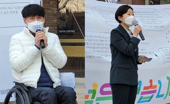 이어 “장애인탈시설 투쟁을 하며 장애인을 보호한다는 말과 인식을 반대한다고, 탈시설을 장애인의 자유로운 삶의 첫걸음이라고 선언했다. 문재인 정부는 국정과제로 장애인 탈시설을 약속했지만 정부는 응답하지 않고 있다”며, “코로나 재난 상황이 장애인들의 현실이 얼마나 열악한지를 보여줬다. 장애인과 비장애인은 함께 살아갈 수 있도록 이 사회를 바꿔나가야 한다”고 요구했다.