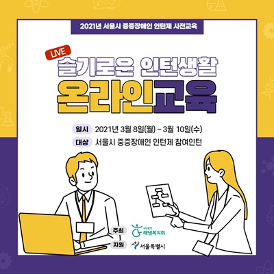 해냄복지회 ‘슬기로운 인턴생활’ 온라인교육 포스터.ⓒ해냄복지회 에이블포토로 보기▲ 해냄복지회 ‘슬기로운 인턴생활’ 온라인교육 포스터.ⓒ해냄복지회해냄복지회가 2021년 서울시 중증장애인 인턴 선발자를 대상으로 사전교육 ‘슬기로운 인턴생활’을 오는 23일까지 진행한다.
