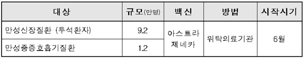 투석환자는 주로 방문하는 의료기관이 정해져 있는 만큼, 가능하면 해당 의료기관에서 예방접종을 진행할 수 있도록 절차를 마련할 계획이다. 백신은 아스트라제네카를 사용하며, 1차 6월, 2차 8월부터 접종한다.