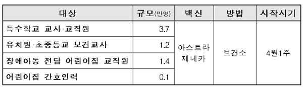 특수학교 교사‧교직원 3.7만명, 장애아동 전담 어린이집 교직원 1.4만명 등이 대상이다. 아스트라제네카 백신을 사용하며, 보건소에서 접종할 예정이다.