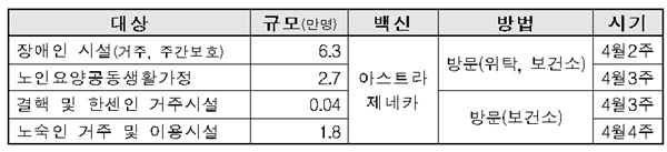장애인, 노인요양공동생활가정, 결핵, 한센인 등 10.8만명 접종개요.ⓒ질병관리청 에이블포토로 보기▲ 장애인, 노인요양공동생활가정, 결핵, 한센인 등 10.8만명 접종개요.ⓒ질병관리청■장애인거주‧주간보호시설 6.3만명, 4월 접종