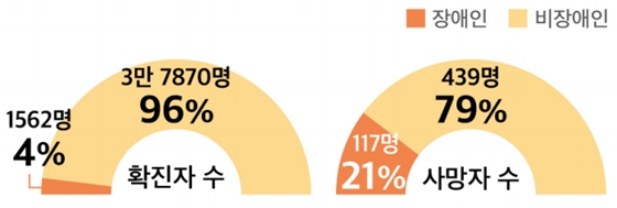 코로나19 장애인·비장애인 확진자 현황. ⓒ한국장애인단체총연맹 에이블포토로 보기▲ 코로나19 장애인·비장애인 확진자 현황. ⓒ한국장애인단체총연맹비장애인보다 6배 높은 확진자 중 사망자 비율