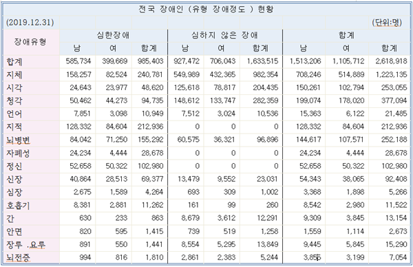 전국 장애인등록현황(2019). ⓒ통계청 에이블포토로 보기▲ 전국 장애인등록현황(2019). ⓒ통계청‘시지프스’는 한태술의 두뇌와 강서해의 액션에다 정현기의 활약까지 보태겠지만, 필자가 하려는 이야기는 당뇨병으로 인한 시각장애인 이야기다.