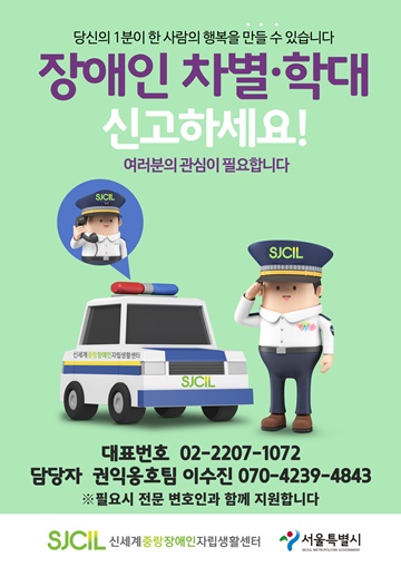 장애인 학대·차별 신고는 신세계중랑센터 홈페이지(http://sjcil.org) 또는 전화(02-2207-1072) 권익옹호팀으로 접수가 가능하다.