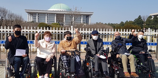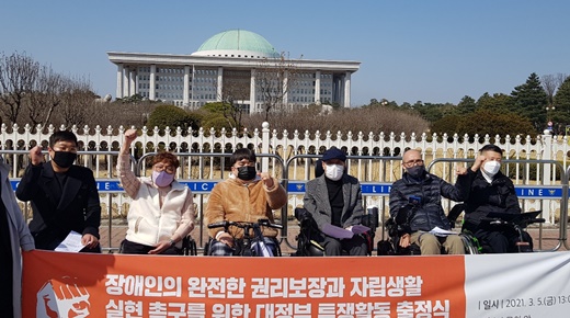 한국장애인자립생활센터총연합회 자립생활권리보장위원회는 5일 국회 앞에서 장애인의 완전한 권리보장과 자립생활 실현을 촉구하기 위한 대정부 투쟁활동 출정식을 열었다.ⓒ에이블뉴스 에이블포토로 보기▲ 한국장애인자립생활센터총연합회 자립생활권리보장위원회는 5일 국회 앞에서 장애인의 완전한 권리보장과 자립생활 실현을 촉구하기 위한 대정부 투쟁활동 출정식을 열었다.ⓒ에이블뉴스-장애인 곁을 든든하게 지켜주는 대안언론 에이블뉴스(ablenews.co.kr)-