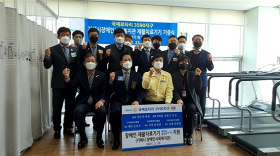 국제로타리 3590지구이 지난 23일 거제시장애인복지관에 지역사회 장애인의 재활과 치료를 위해 1,600만 원 상당의 장애인 재활치료기구를 전달했다. ⓒ거제시장애인복지관