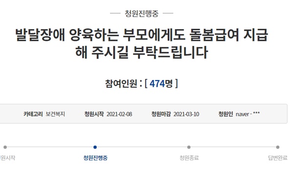 청와대 국민청원 캡쳐 내용.ⓒ청와대 홈페이지 에이블포토로 보기▲ 청와대 국민청원 캡쳐 내용.ⓒ청와대 홈페이지발달장애를 양육하는 부모에게도 ‘돌봄급여’를 지급해달라는 요청이 청와대 국민청원에 게재됐다.
