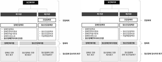첫 번째는 장애인복지법 15조를 폐지하고 정신건강복지법에서 복지 영역을 확대하는 방법으로 정신장애인의 서비스 차별을 해소하되 전달체계를 이원화해 정신장애로 인한 복지욕구는 장애인정책국 산하 정신장애인복지과 소관으로 하는 방안이다.