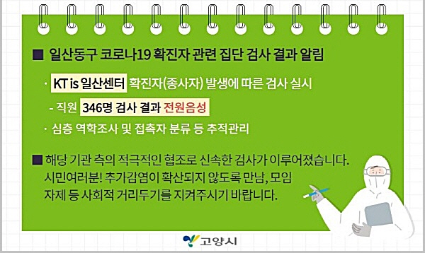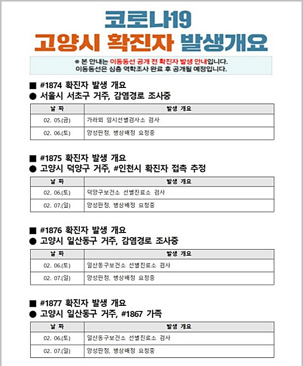 이 밖에도 6일 저녁 고양시민 2명이 김포시보건소(일산서구 거주자), 서대문구보건소(덕양구 거주자)에서 각각 확진판정을 받았다.