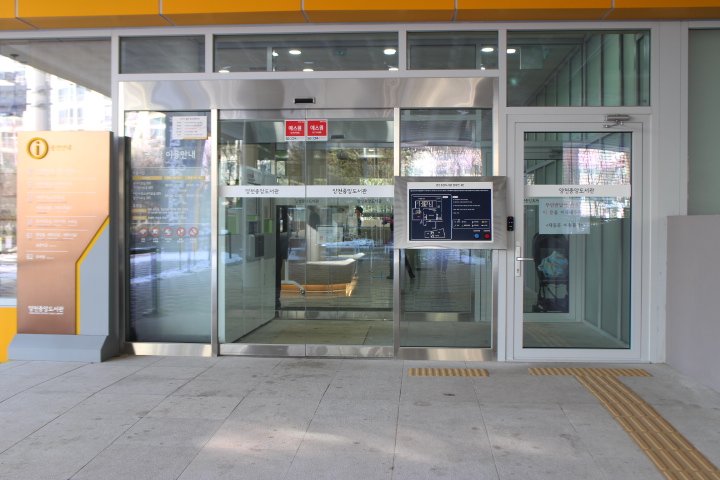 주출입문 옆에 설치된 시각장애인이 손끝으로 만져 건물 내부를 알 수 있는 점자안내판에는 점자를 읽지 못하는 시각장애인을 위한 음성안내기와 인적 서비스를 요청할 수 있는 직원호출벨이 설치됐으며, 앞바닥에 점자블록은 양호하게 설치됐다.