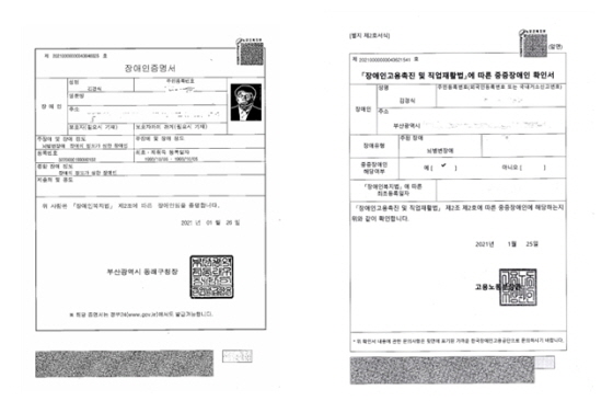 장애인증명서와 중증장애인증명서 ⓒ김경식 에이블포토로 보기▲ 장애인증명서와 중증장애인증명서 ⓒ김경식이러한 혼선에 대비하고자 직업재활 측면에서 고용노동부에서 발급하는 ‘장애인 고용촉진 및 직업재활법에 다른 중증장애인 확인서’가 장애등급제 개편이 시행된 2019년 7월 1일부터 시행 중이다.