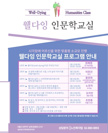 ’웰다잉 인문학교실‘포스터.ⓒ실로암시각장애인복지관 에이블포토로 보기▲ ’웰다잉 인문학교실‘포스터.ⓒ실로암시각장애인복지관실로암시각장애인복지관이 65세 이상 시각장애 어르신을 대상으로 여가문화 프로그램 ‘웰다잉 인문학교실’ 이용자를 오는 10일까지 모집한다.