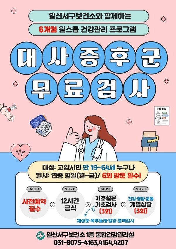 고양특례시(시장 이동환) 일산서구보건소는 대사증후군 검진 및 맞춤형 건강상담을 한 곳에서 받을 수 있는‘건강원스톱서비스’를 연중 상설 운영한다.