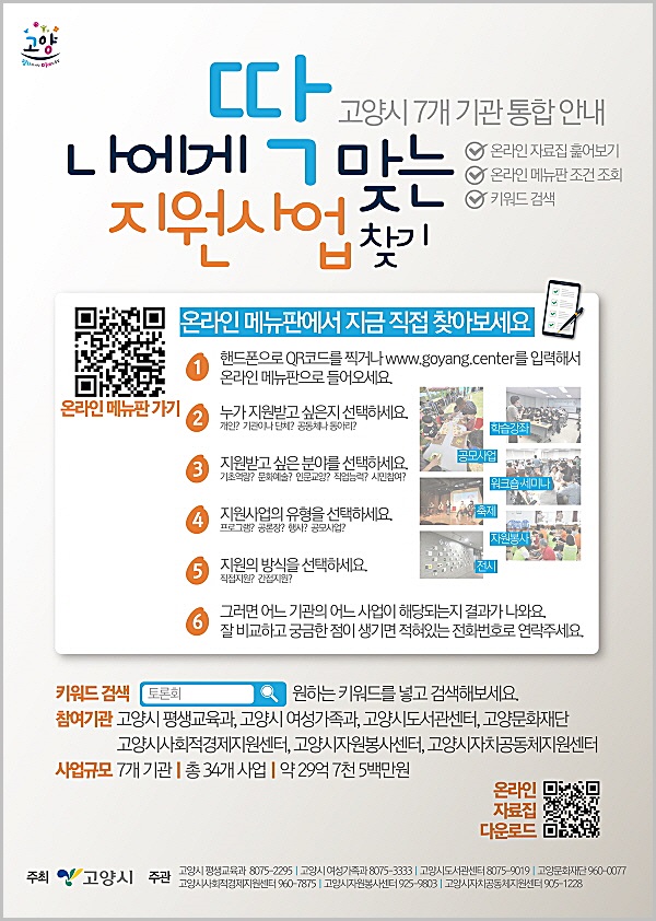 온라인 자료집 내려받기, 개인별 맞춤형 사업 조회 등은 ‘나에게 딱 맞는 지원사업 찾기’ 사이트(goyang.center/goyang/event2021)에서 확인 할 수 있다.