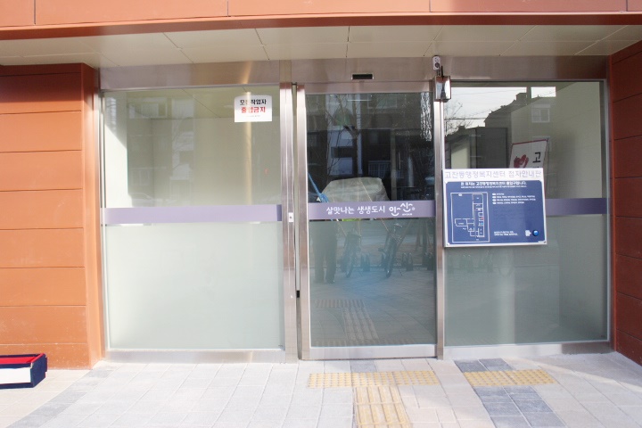주출입구 출입문은 자동문만 설치됐고, 자동문 앞바닥에 점자블록이 설치돼 있어 휠체어를 사용하는 장애인이나 시각장애인 모두 이용에 불편을 겪는다.