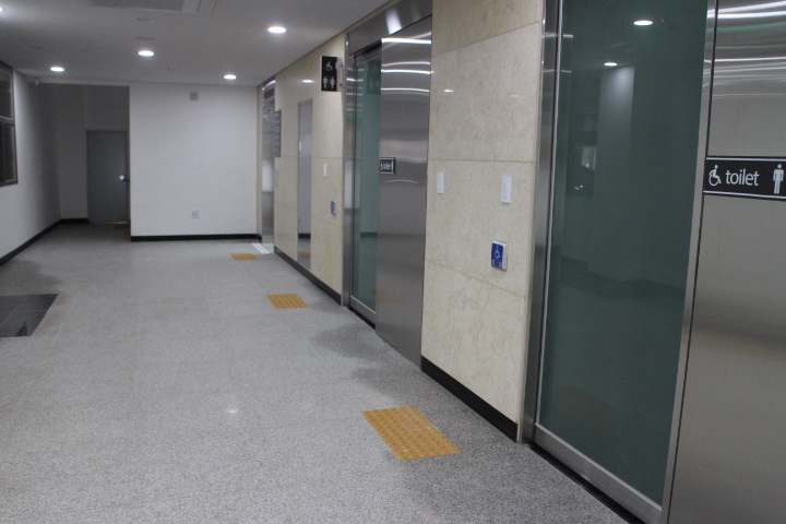 각 층 남녀비장애인화장실 입구 벽면에는 시각장애인이 손끝으로 만져 층수를 알 수 있는 점자표지판, 앞바닥에 점자블록이 양호하게 설치됐다.