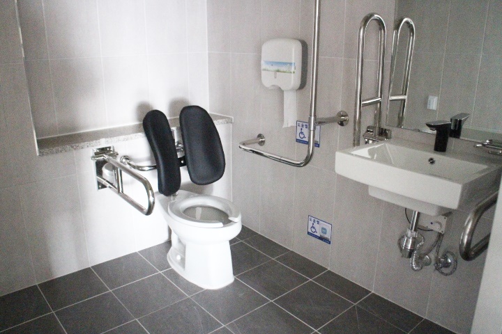 장애인화장실 내부는 대변기에 자동 물 내림 센서와 등받이가 설치됐으며, 휴지걸이와 비상호출벨은 대변기에 앉았을 때 손이 닿는 곳에 위치해 있다. 세면대 손잡이 또한 휠체어 접근을 용이하게 하는 상하가동식이다.