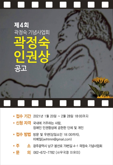 에이블포토로 보기▲ ‘제4회 곽정숙 인권상’ 공고. ⓒ곽정숙 기념사업회곽정숙 기념사업회가 오는 20일부터 2월 28일까지 ‘제4회 곽정숙 인권상’ 후보자 추천을 받는다.