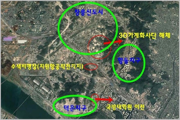 이어 “그 대표적인 군사시설이 화전에 있는 수색비행장 또는 항공대비행장이라고 알고 있는 비행장(지원항공작전기지로 기지명은 ‘G-113’)으로, 수색비행장은 길이 1200m 콘크리트 활주로로 항공대가 실습용 비행기 운항을 위해 1955년 건립했으며, 육군 항공대대(제11항공단)가 비행장을 소유하고 제반 운영권은 한국항공대학교가 보유·관리하고 있다”며 “그러나 상암지구가 조성되던 2014년경에 소음문제와 항공기 충돌 우려 등 주민들의 불안을 이유로 제주 정석비행장과 울진, 무안공항으로 이전 실시하게 되면서 항공대 비행교육은 수색비행장에서 완전히 사라졌다”고 밝혔다.