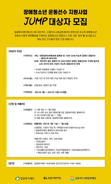 KB국민카드와 신용카드사회공헌재단의 후원으로 진행중인 ‘점프’는 저소득 장애인 운동선수들이 재능을 발휘할 수 있도록 체육활동비를 지원하는 사업이다.