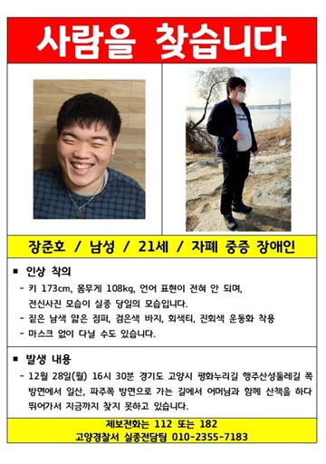 한편, 제보 전화는 112나 182, 고양경찰서 실종전담팀(010-2355-7183)으로 하면 된다.