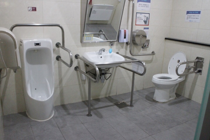 남성장애인화장실 내부의 경우 세면대와 대변기의 거리가 가까워 휠체어를 사용하는 장애인이 대변기에 옮겨 앉기 힘들다.