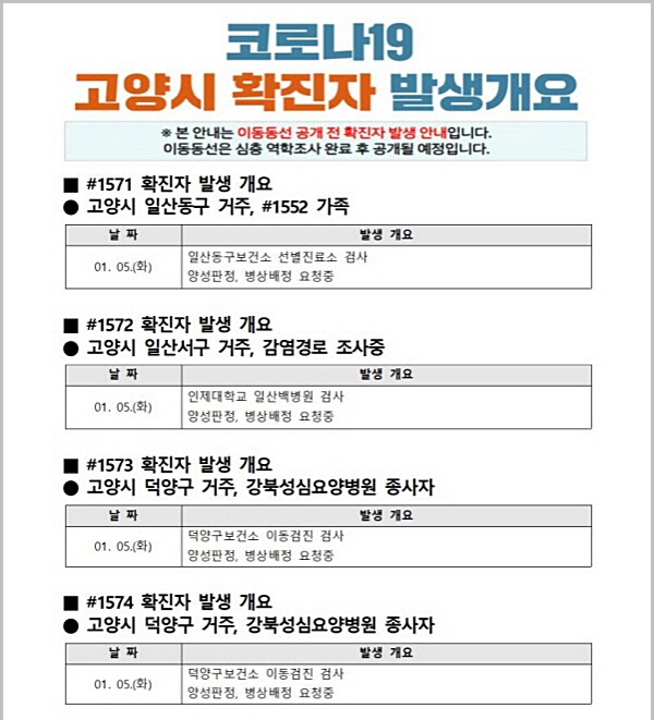 지난 1월 1일 첫 확진자가 나온 덕양구 소재 강북성심요양병원에서 환자 1명과 종사자 2명, 종사자의 가족 2명 등 5명이 추가 확진판정을 받아 관련 누적 확진자 수는 20명이 됐다. 또한 시는 확진자 방문과 관련, 지난 1월 2일 09:00~15:00와 1월 3일 15:00~21:00에 다이소 고양원당점(덕양구 고양대로 1351, 주교동) 방문자 중 유증상자는 인근 보건소선별진료소에서 코로나19 검사를 받으라고 당부했다.