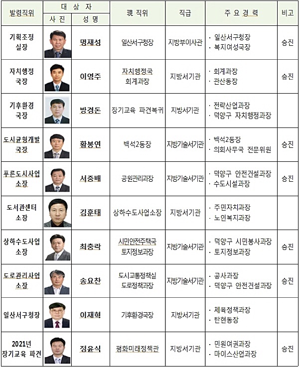 도시균형개발국장에는 황봉연 백석2동장이, 푸른도시사업소장에는 서중배 공원관리과장이, 상하수도사업소장에는 최충락 토지정보과장이, 도로관리사업소장은 송요찬 도로정책과장(이상 지방기술서기관 승진)이, 도서관센터소장은 김훈태 상하수도사업소장이, 일산서구청장에는 이재혁 기후환경국장이 각각 이름을 올렸다. 아울러 지방서기관으로 승진한 정윤식 평화미래정책관은 1월말 4급 장기교육(지방자치인재개발원) 대상자로 파견 예정이다.
