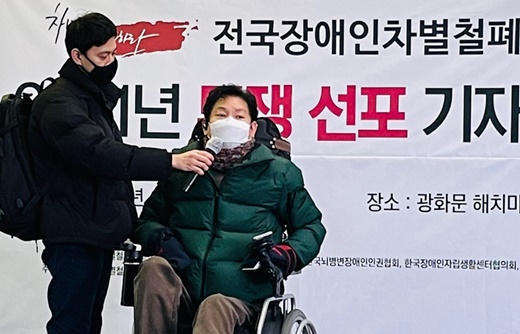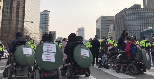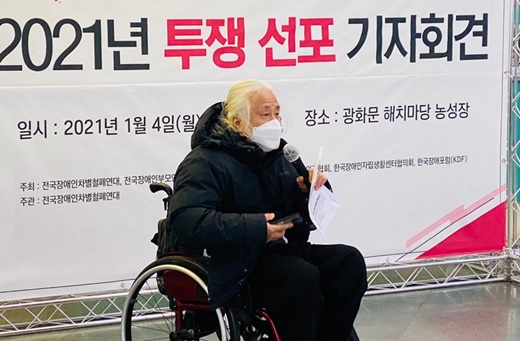 전국장애인차별철폐연대(전장연)가 4일 서울 광화문 해치마당 앞에서 ‘2021 장애인차별철폐 투쟁선포 기자회견’을 개최했다.ⓒ전국장애인차별철폐연대 에이블포토로 보기▲ 전국장애인차별철폐연대(전장연)가 4일 서울 광화문 해치마당 앞에서 ‘2021 장애인차별철폐 투쟁선포 기자회견’을 개최했다.ⓒ전국장애인차별철폐연대