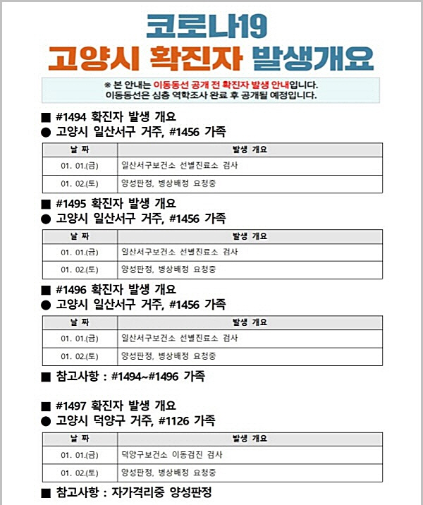 가족 간 감염자 8명, 타 지역 확진자 접촉 5명, 지역 내 확진자 접촉이 1명, 고양시에서 확진판정 받은 타지역 주민이 3명이고, 나머지 6명에 대해선 감염경로가 조사 중이다.